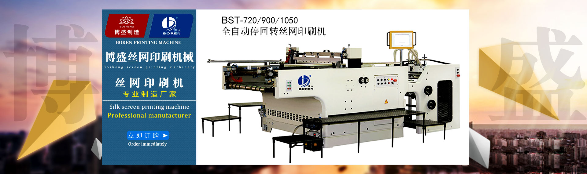 瑞安市博盛絲網(wǎng)印刷機(jī)械廠是一家專業(yè)集生產(chǎn)加工,經(jīng)營批發(fā)的私營獨(dú)資企業(yè)。制造各類全自動(dòng)絲網(wǎng)印刷機(jī)、卷對(duì)卷全自動(dòng)(無紡布)網(wǎng)印機(jī)、全自動(dòng)卷筒式網(wǎng)印橫切一體機(jī)、半自動(dòng)平升式、斜臂式微電腦控制精密網(wǎng)印機(jī)、紫外線(UV)光固機(jī)、絲印真空曬版機(jī)、烘版機(jī)、熱風(fēng)烤(烘)箱、組合式(IR)紅外線烘道、機(jī)械式精密... 查看詳情>>